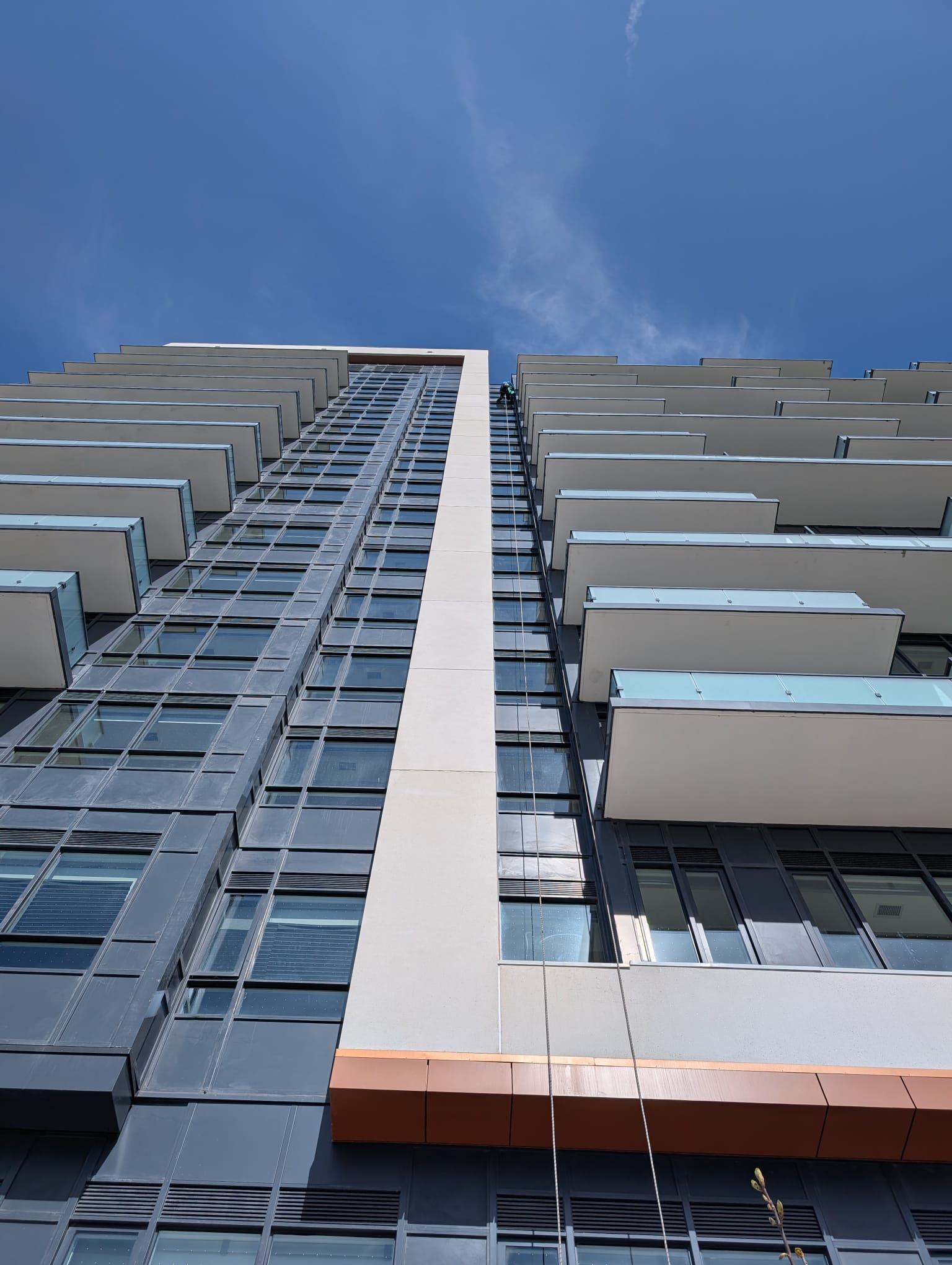 Patched precast panels using rope access for hard-to-reach areas.